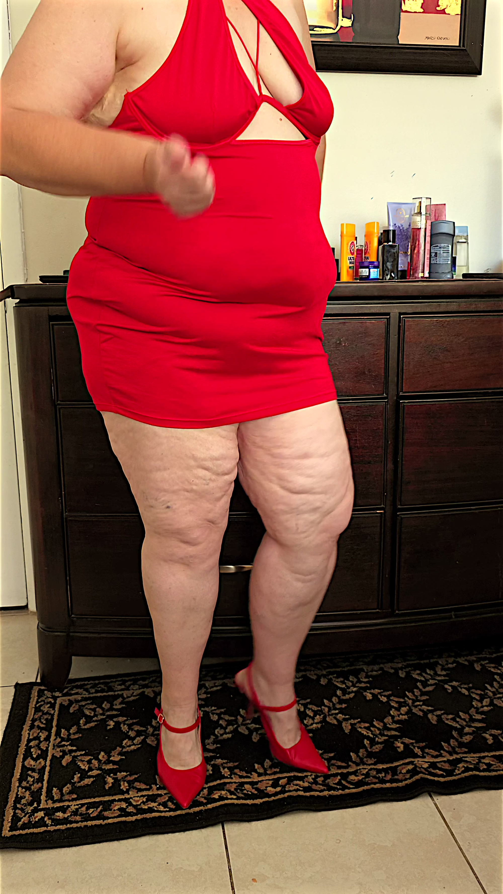 Beautiful social media model in mini red dress and high heels showing off